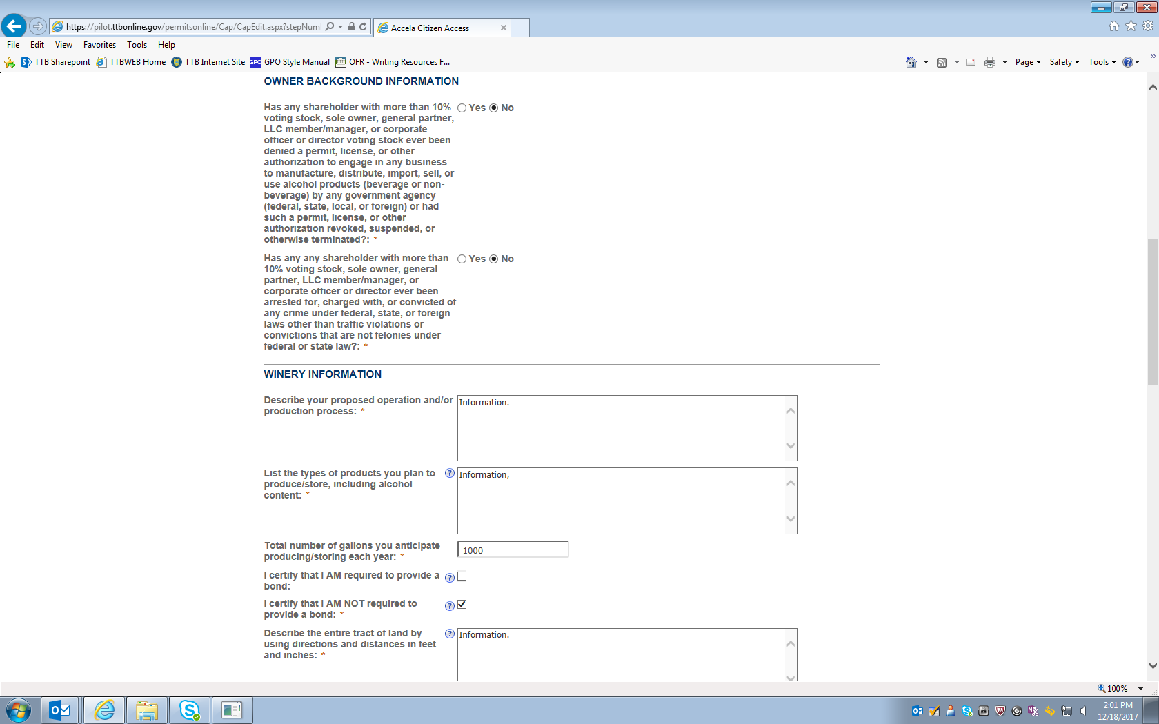 Figure 14 – Additional Winery Permit information screen (continues on page below).