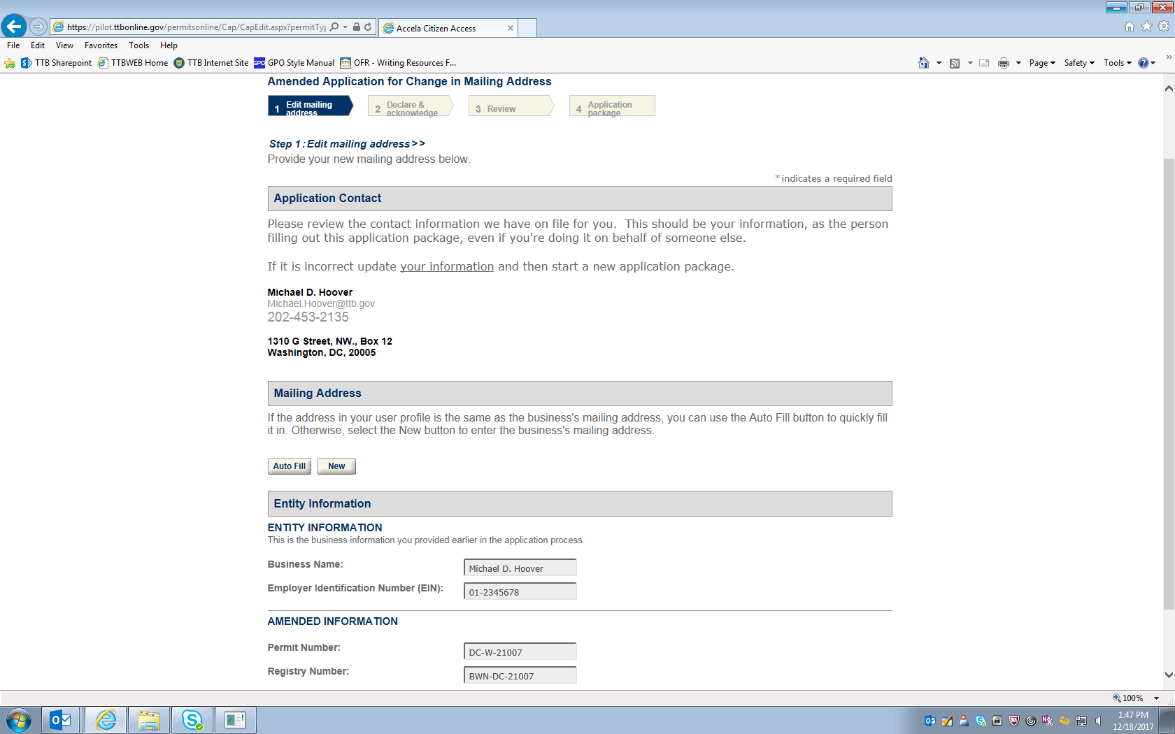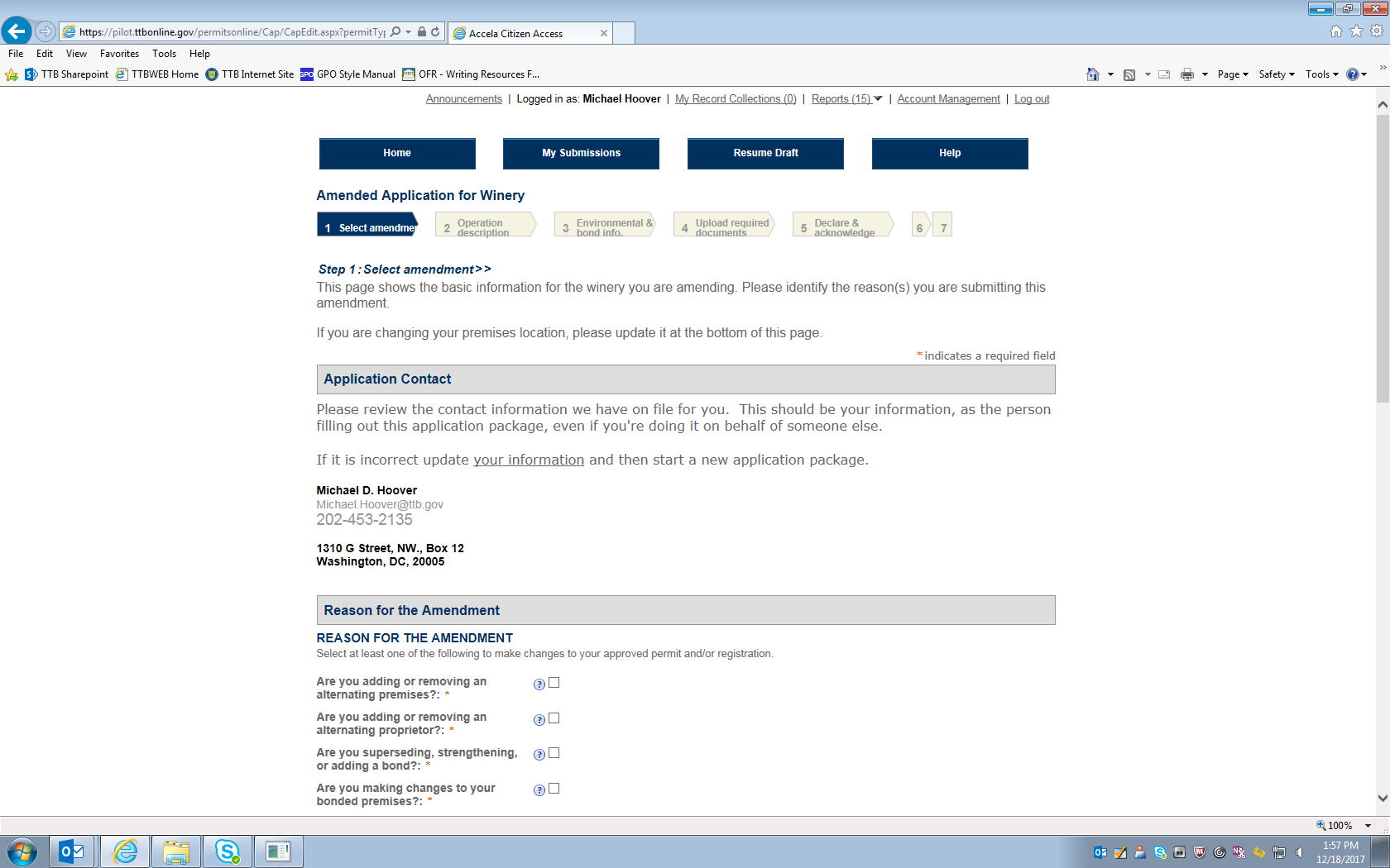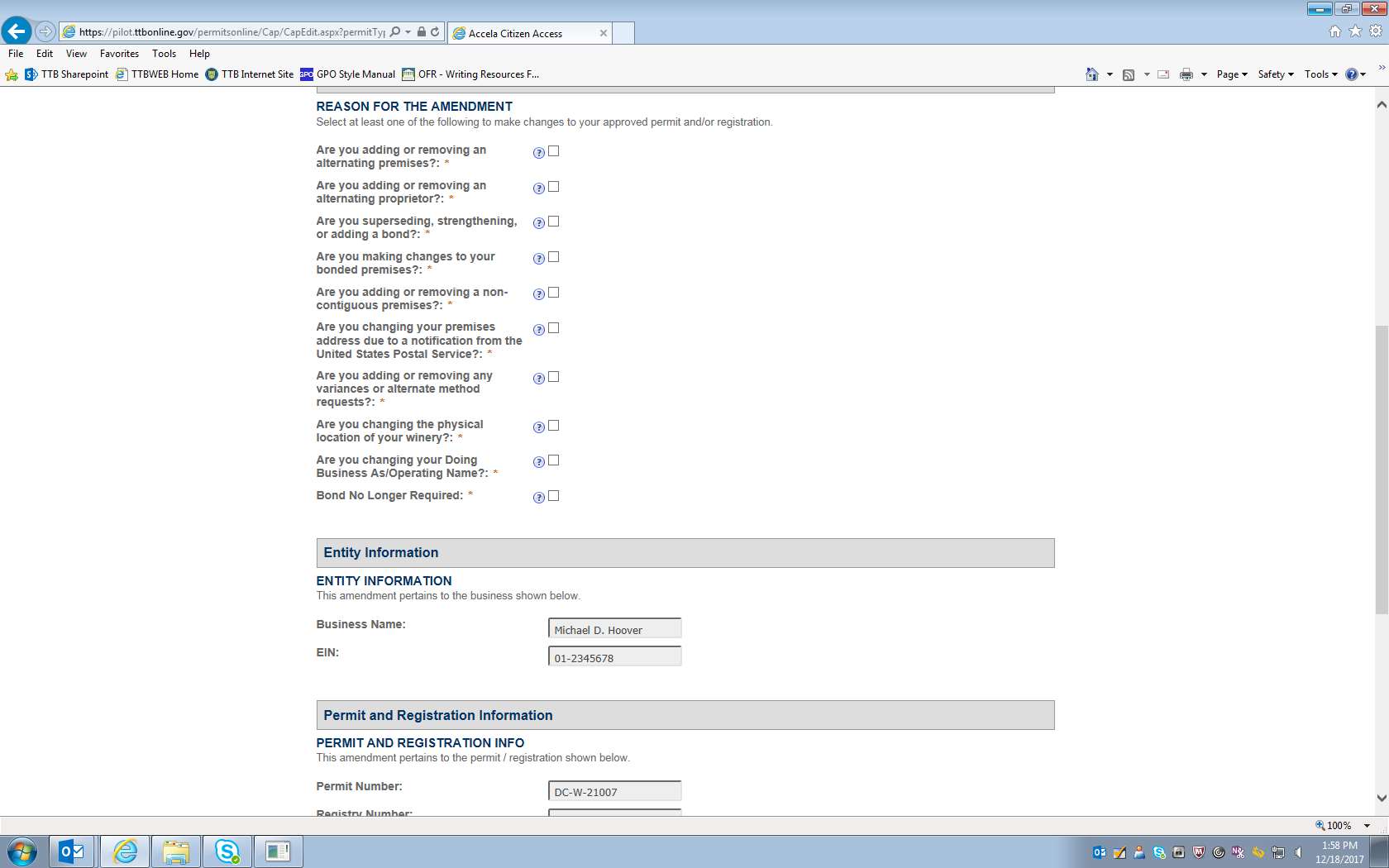 NOTE: This example involves changes to an FAA Act basic permit for a winery. Applications for amendments to distilled spirits, alcohol importer, or alcohol wholesaler FAA Act basic permits use the same or very similar data fields to collect the required information.