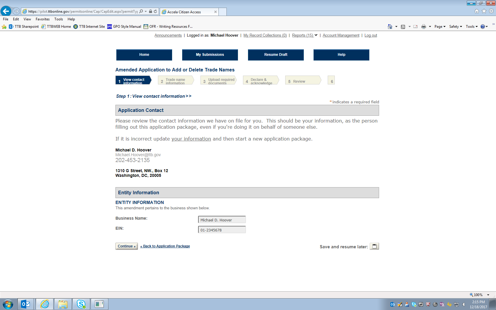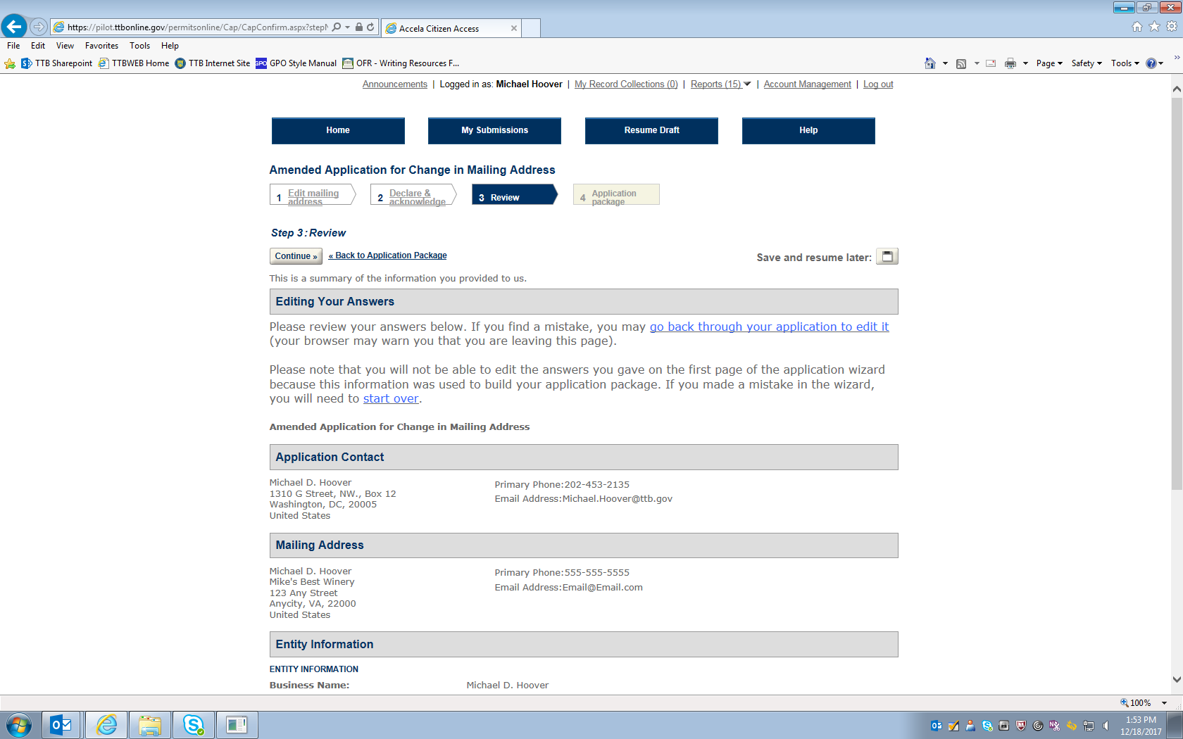 Figure 13 – This screen (which continues on the next three pages below) shows the current information for the winery in question, and the respondent may amend any of the stated information on this screen. In this example, the “Doing Business Name” is amended from “Mike’s Best” to “Mike’s Very Best.”