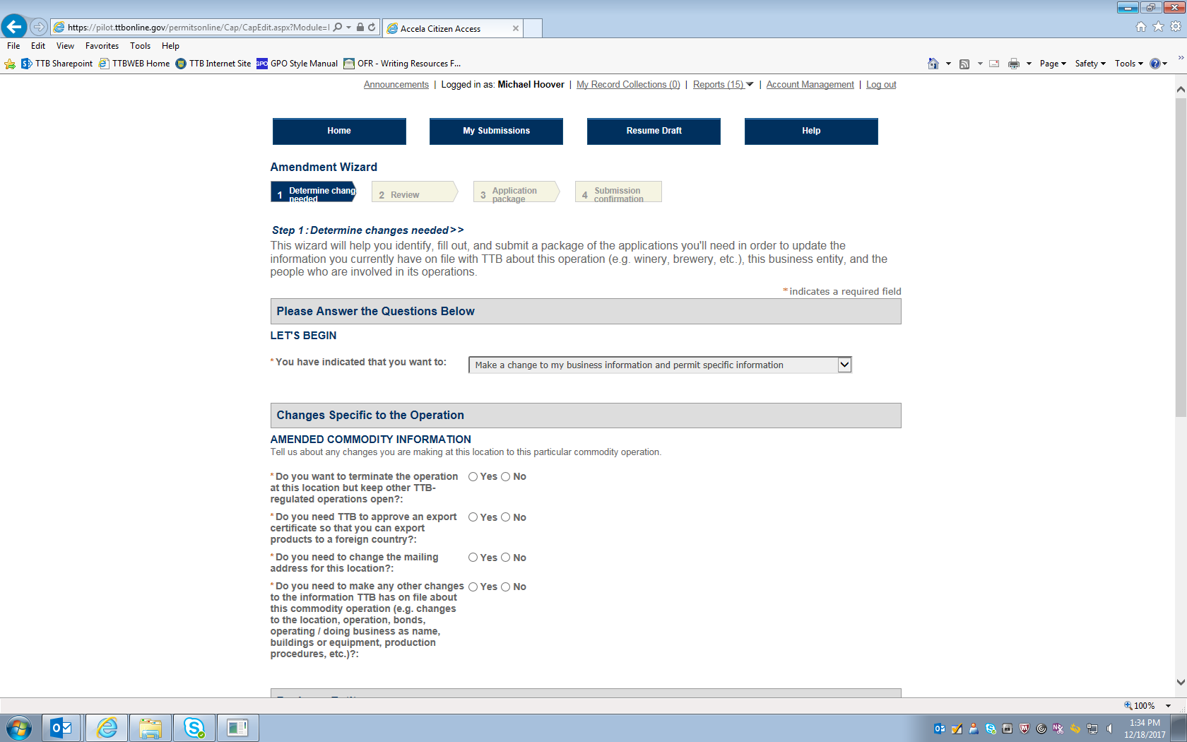 Figure 3 – The respondent next sees this screen which asks questions regarding the type of amendment being applied for. (Screen continues below on next page.)