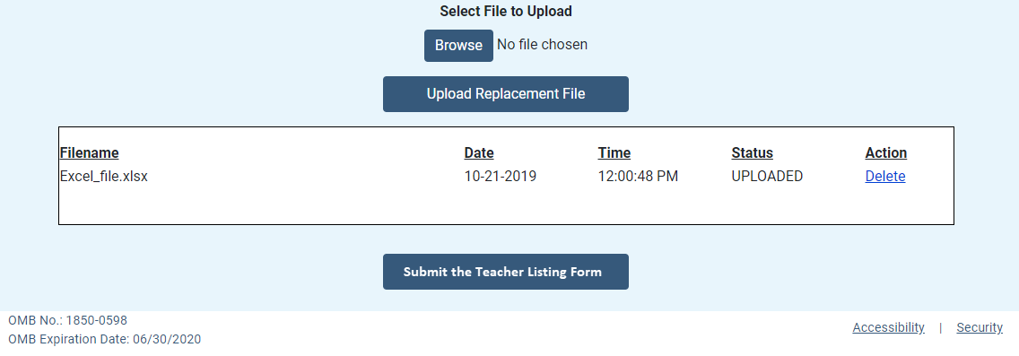 Once the respondent has uploaded a file using the “Browse” and “Upload file” buttons, the file is listed in the box on the page, as shown below. Respondents who use the template may either review or submit their Teacher Listing Form from this page. Respondents who click “Review the Teacher Listing Form” are directed to the Summary page. Respondents who do not use the template are able to submit their Teacher Listing Form by clicking on “Submit the Teacher Listing Form”, but cannot review it.