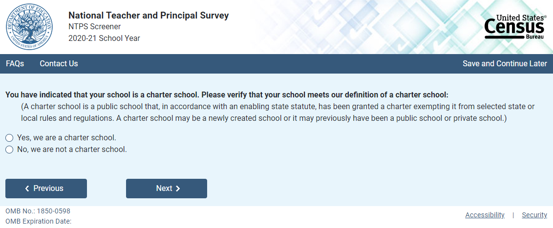 A respondent accesses this page only if (s)he selected “Charter School” as the school type on Screener Interview Page 4.