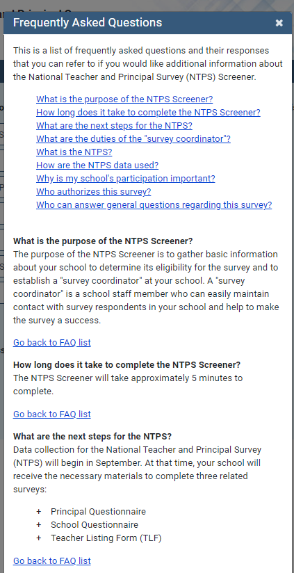 This is a list of frequently asked questions and their responses that you can refer to if you would like additional information about the National Teacher and Principal Survey.