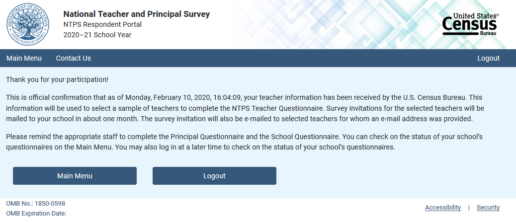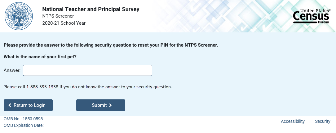 Please contact the U.S. Census Bureau at 1-888-595-1338 if you have any questions about the survey. Someone will be available to take your call Monday through Friday, between 8:00 a.m. and 8:00 p.m. (Eastern Time). At any other time, please leave a message and someone will return your call as soon as possible. The U.S. Census Bureau is also available to answer your questions via e-mail at ntps@census.gov.