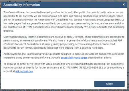 Accessibility is a modal pop-up that will appear over whichever page the respondent was on when (s)he clicked on the “Accessibility” link located on the bottom of the webpage.
