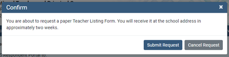 Request Questionnaire is a modal pop-up. The modal text varies based on the questionnaire requested (i.e., the questionnaire name is included in the modal pop-up). The image below is for a Teacher Listing Form request.