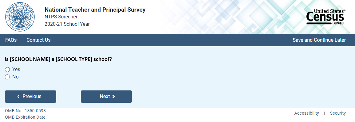 The NTPS Screener is a web-based survey, the purpose of which is to collect basic information about the school, confirm the eligibility of the school in the NTPS, and establish a point of contact at the school (a “survey coordinator”) for subsequent NTPS data collection operations.