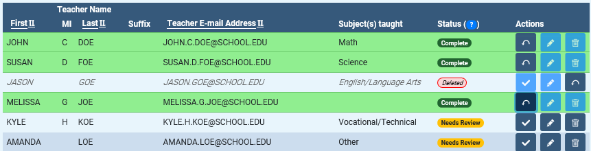The formatting of the teacher rows changes as the respondent confirms or deletes teachers, as shown below: