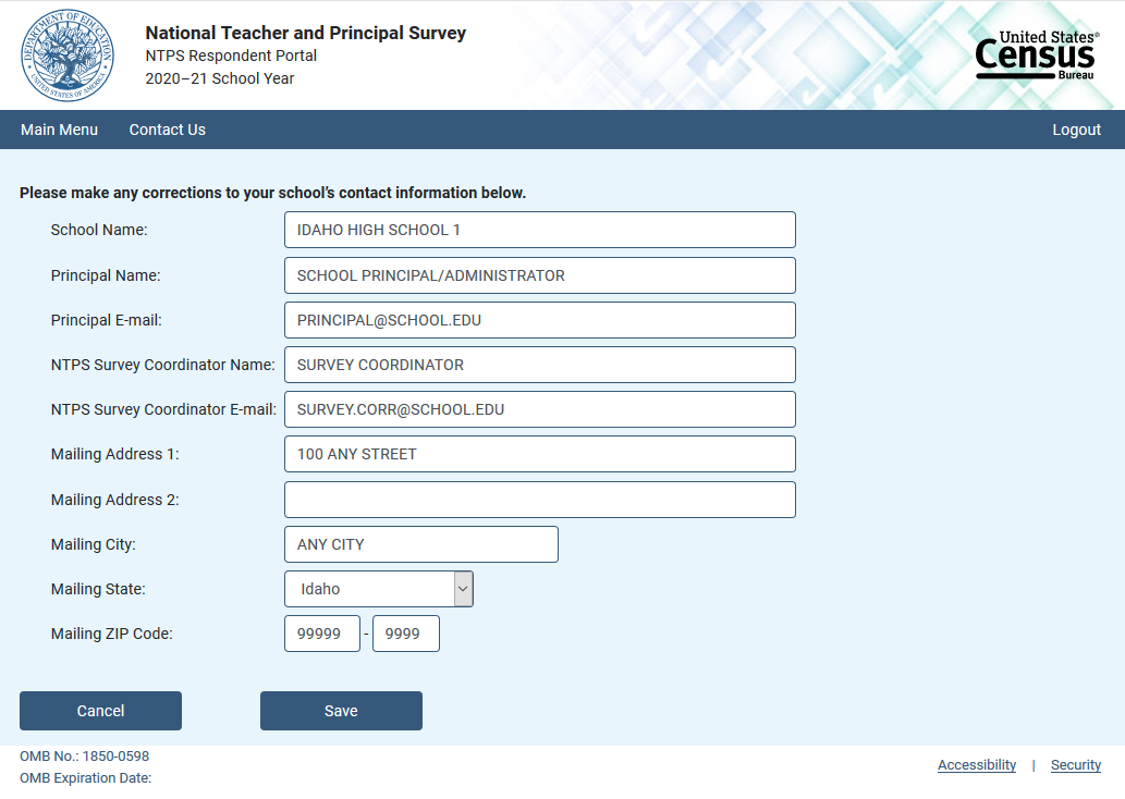 NOTE: Name and address fields are pre-filled with the sampled school’s information; however, only the address fields (not school name) can be edited on this page.