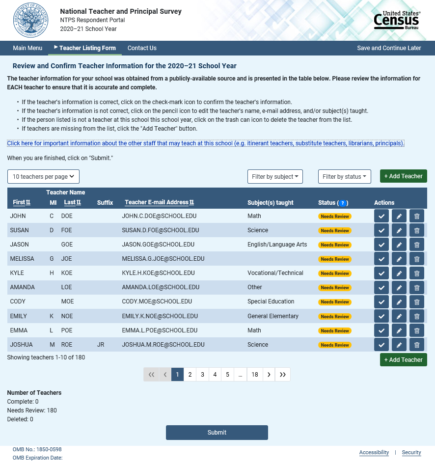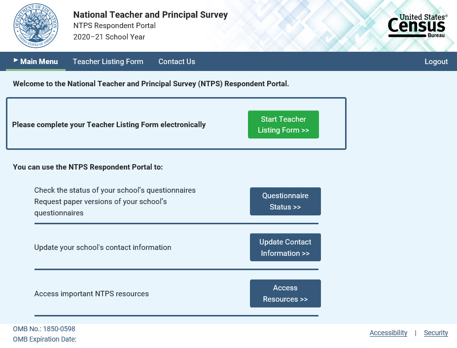 NTPS Online Screener and Respondent Portal Website Including Teacher Listing Form (TLF)