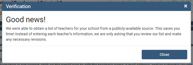 Respondents in schools with a pre-populated Teacher Listing Form are asked to review and confirm the pre-populated list. When they enter the Summary page, they receive the following modal pop-up over the Summary page shown below: