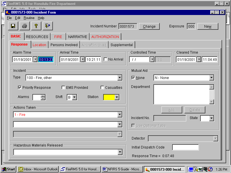 Mutual Aid: If no mutual aid is given or received check the “None” box. If aid is given or received use pull down to select the appropriate choice. Next click on the “Add” button and select a Fire Department. If aid is given, you will have to get an Incident Number from FCC for the Fire Department that we aided. This Incident Number must be seven-digits so prefix the number with the appropriate number of zeros. If we responded without a response from another Fire Department put in our seven-digit incident number in the “Incident No.” field. Pull down “HI” as the State.