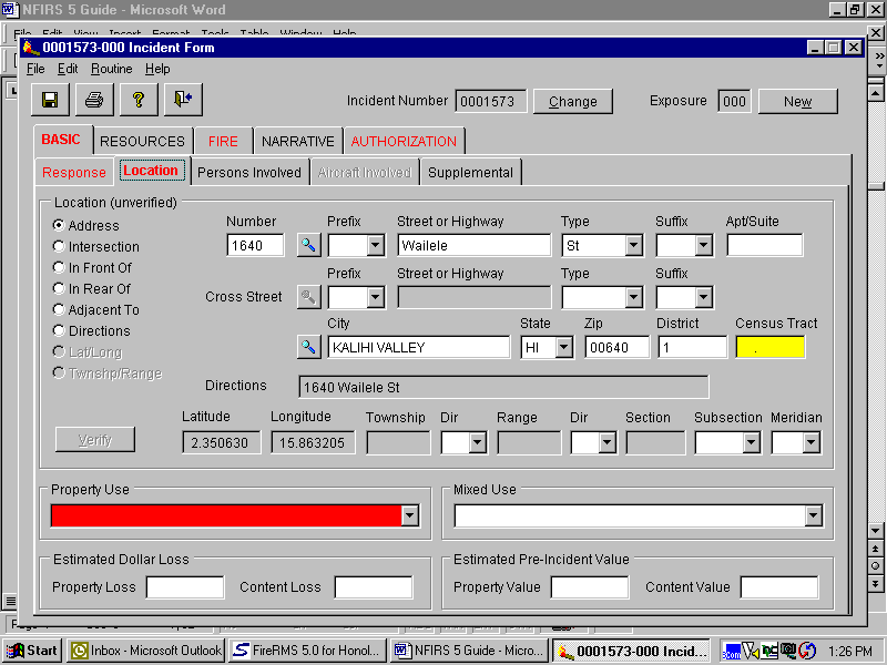 Street or Highway: CADS will drop in address. Make any corrections to address if different from location dispatched to. Use the exact name of Street or Highway, e.g. Ainanui, H1, Pali, Kamehameha, etc. Do not abbreviate the street name and do not use the Hawaiian “okina” symbol.