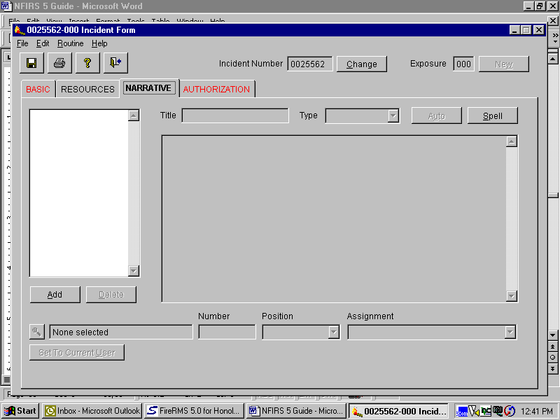 Every Incident must have a Narrative. It is recommended that the Auto Narrative feature be used. To use this feature, click on the “Add” button, Title your narrative, tab off and click the “Auto” button. You can now add to or correct information contained in the narrative.