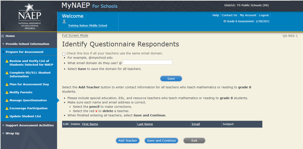 NAEP collects information using questionnaires to provide a context for reporting student performance. The Teacher Questionnaire is used to gather information concerning years of teaching experience, frequency of assignments, use of teaching materials, and availability and use of computers. Teacher Questionnaires should be completed by grade [SMPGRD] teachers who teach math, reading, social studies, and/or writing. Your school coordinator, [SCHOOLCOORDINATORNAME], has designated you as a respondent for the [SUBJECTNAME] Teacher Questionnaire.