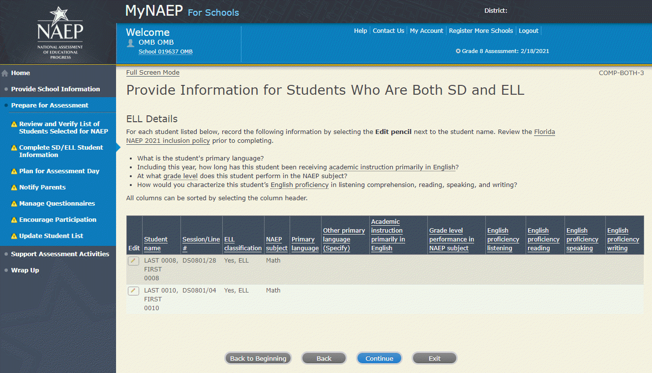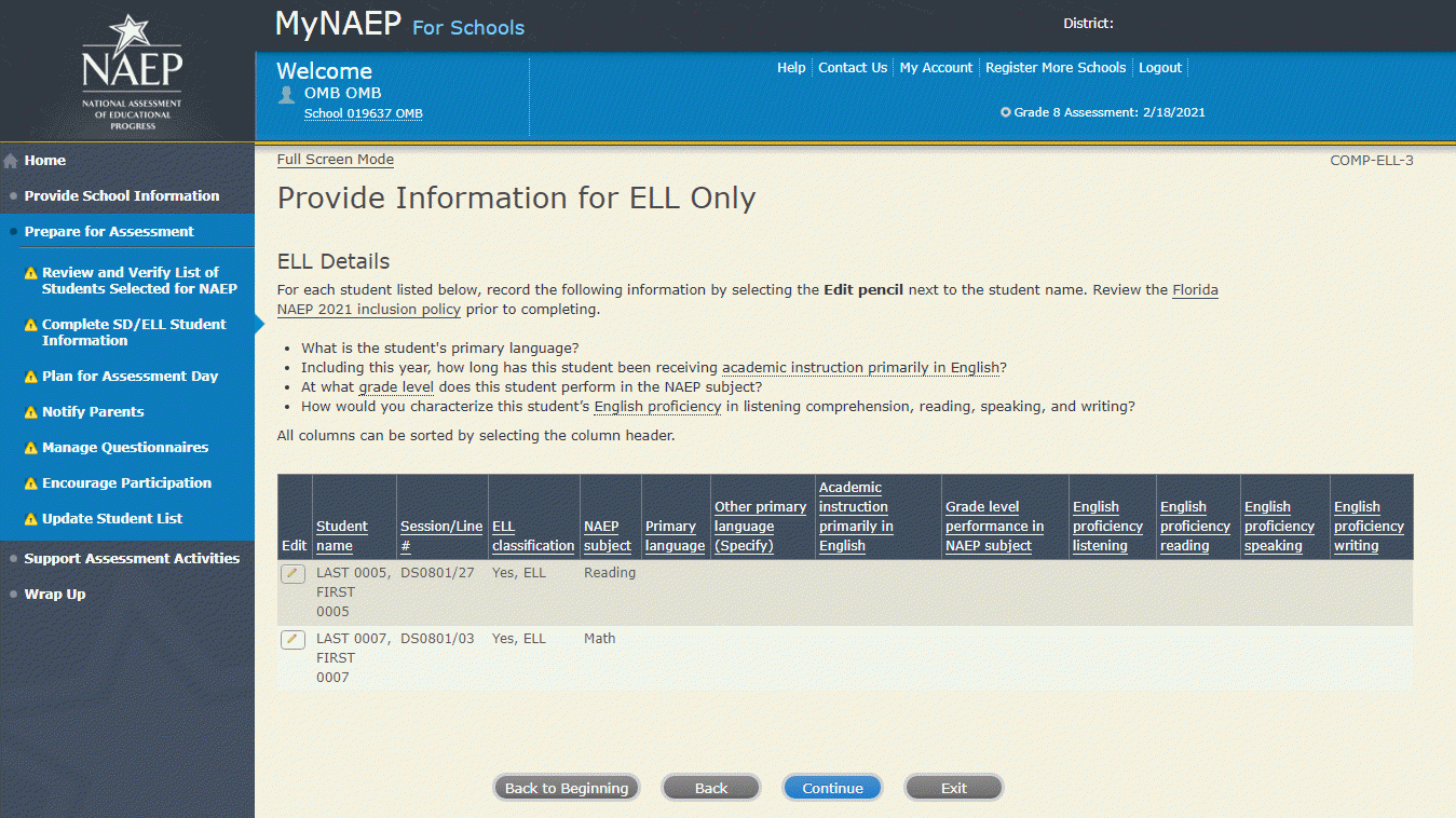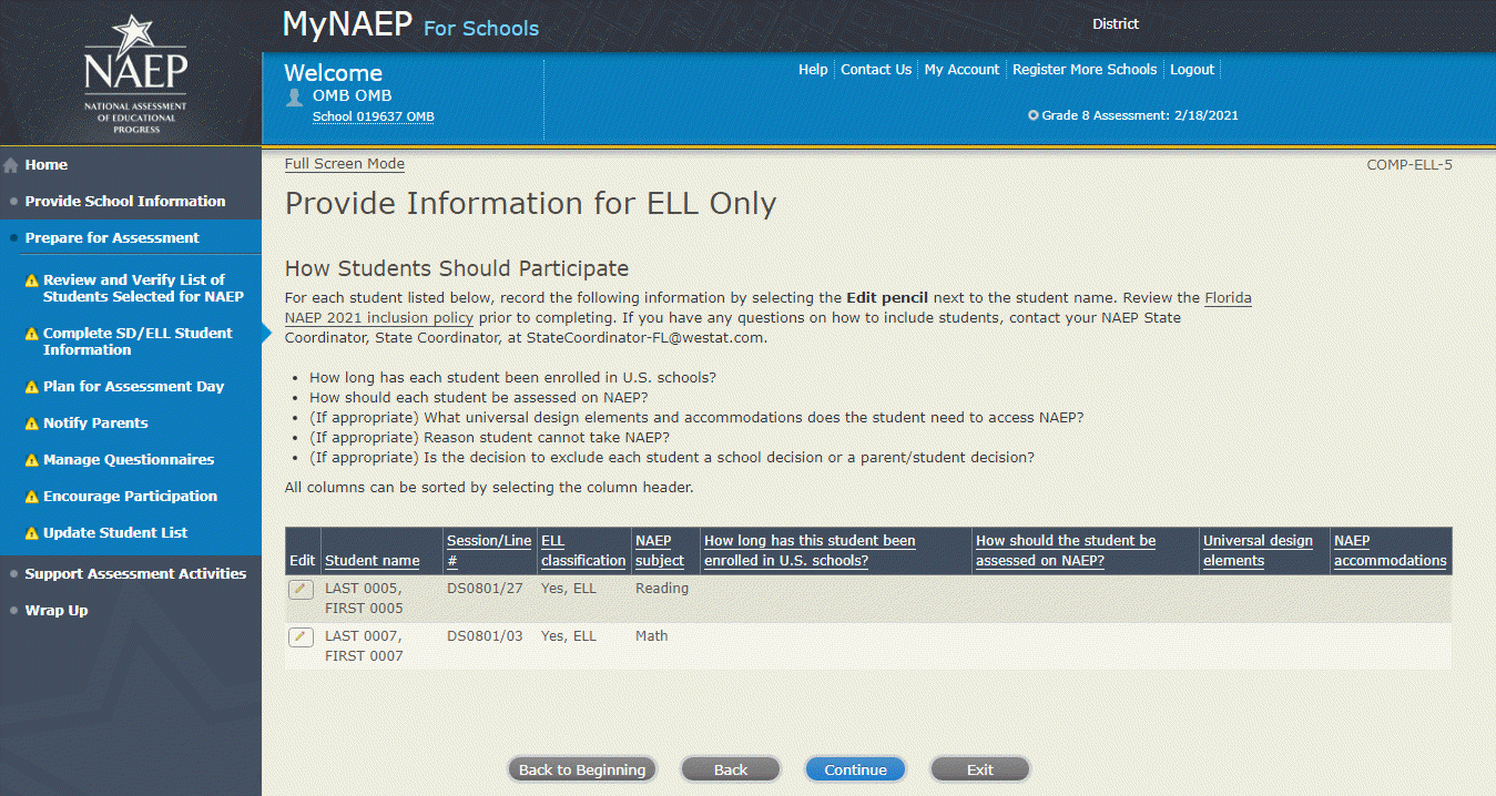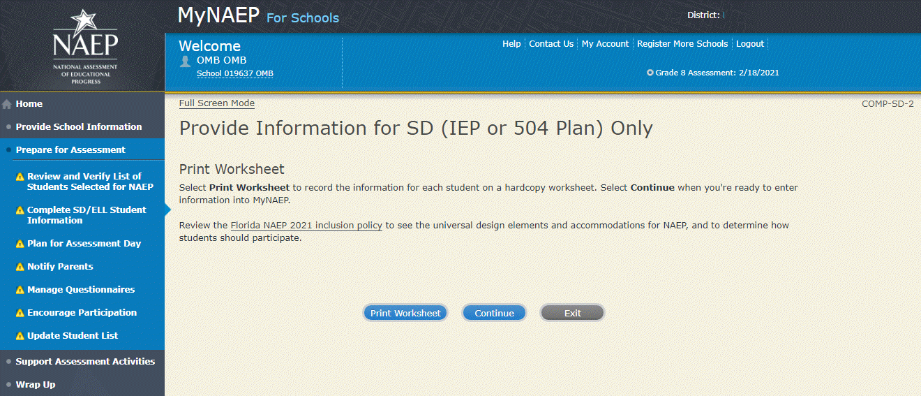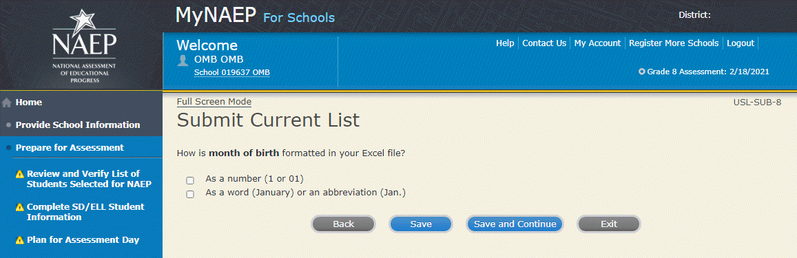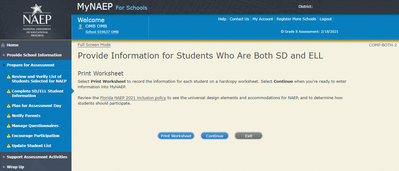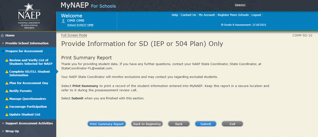 According to the Paperwork Reduction Act of 1995, no persons are required to respond to a collection of information unless it displays a valid OMB control number. The valid OMB control number for this voluntary information collection is 1850-0928. The time required to complete this information collection is estimated to average 270 minutes for schools that do not submit student sample information or 390 minutes for schools that submit student sample information manually, plus an additional 10 minutes for each student identified as SD or ELL, including the time to review instructions, search existing data resources, gather the data needed, and complete and review the information collection. If you have any comments concerning the accuracy of the time estimate, suggestions for improving this collection, or any comments or concerns regarding the status of your individual submission, please write to: National Assessment of Educational Progress (NAEP), National Center for Education Statistics (NCES), Potomac Center Plaza, 550 12th St., SW, 4th floor, Washington, DC 20202.