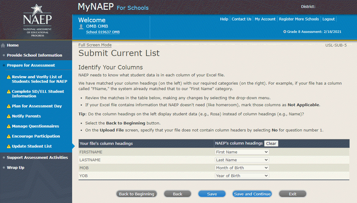 If MyNAEP cannot process your file, try selecting the Back button and revising your answers about how the Excel file is formatted. In the example below, the user checked the wrong box for the number of digits in the birth year. The red text at the top of the screen will display the number of digits in the birth year (in this case, four).