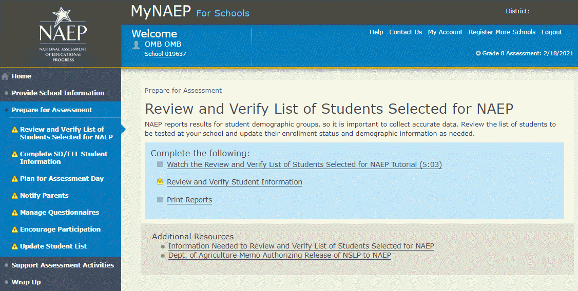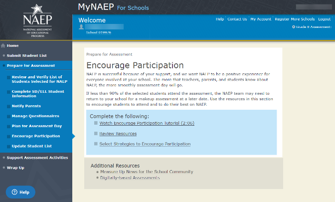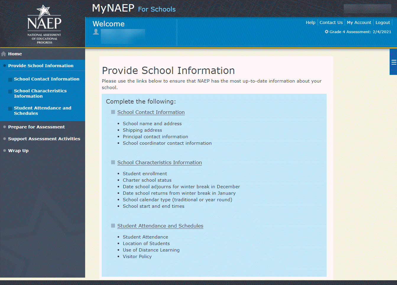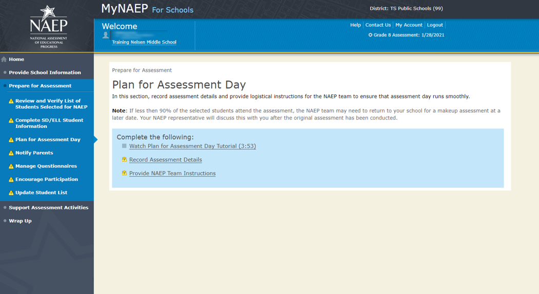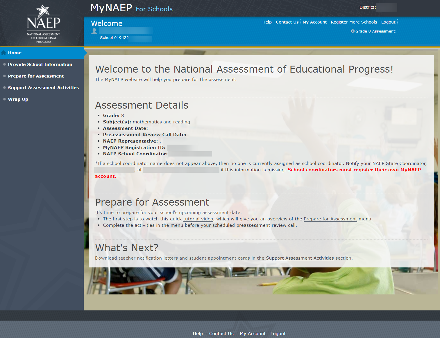 Description of MyNAEP: The school coordinators are responsible for preparing for the assessment in their school using the MyNAEP system, which is an online secure site that provides participating schools with a convenient way to prepare for the upcoming assessment. MyNAEP serves as the primary resource and action center throughout the assessment process. The site also offers school coordinators an electronic way to prepare for the assessment at their own pace. The NAEP field representative will schedule an initial call in December to pre-review the major areas of the MyNAEP system with the school coordinator. A description of the tasks completed in the MyNAEP system can be found in Part B. The content of the MyNAEP system is included in this appendix.