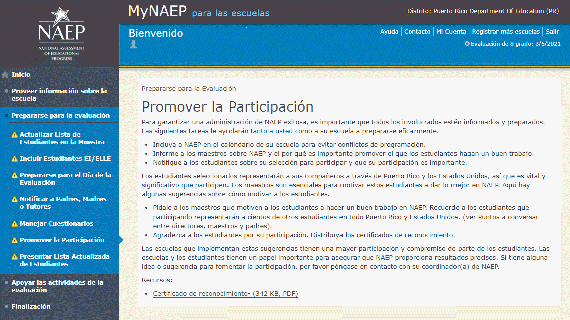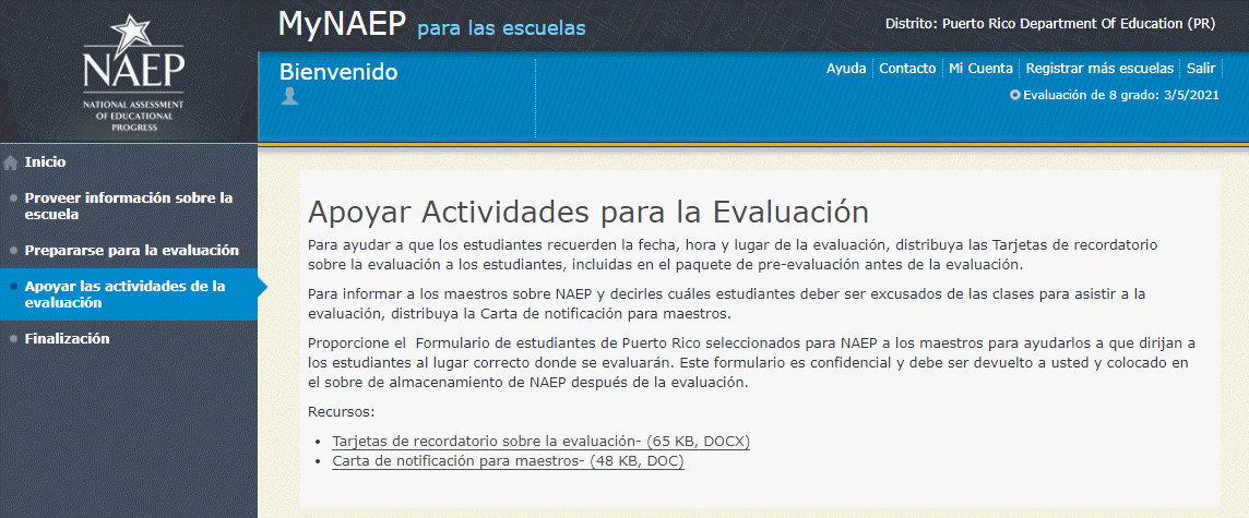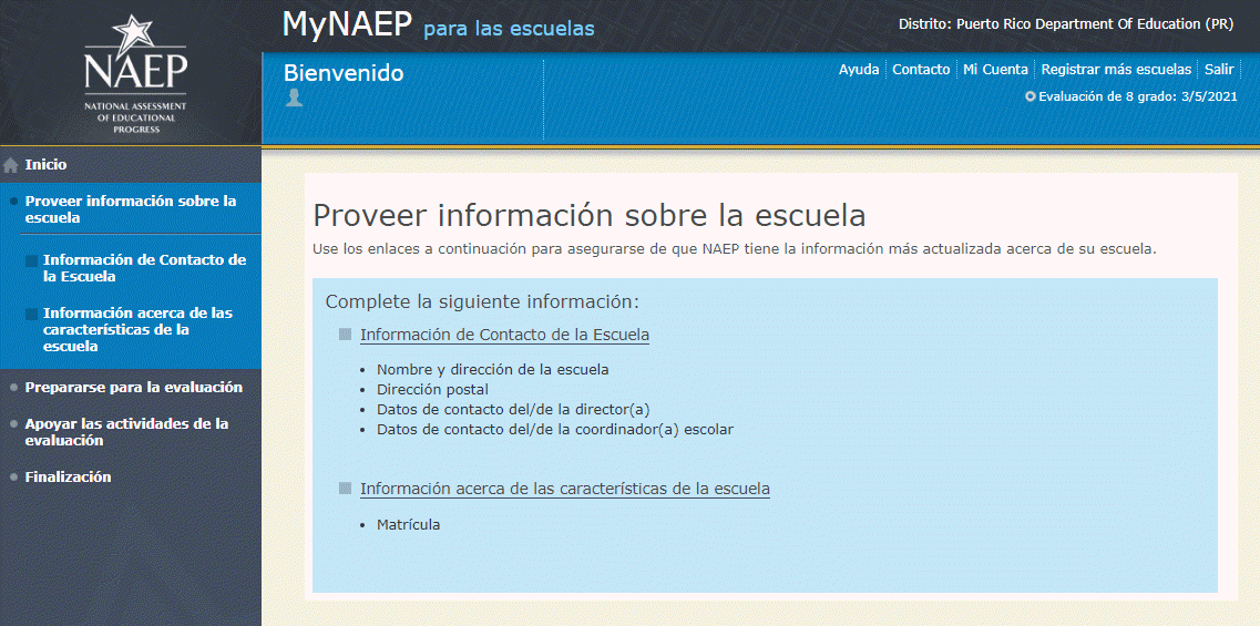 Description of MyNAEP for Puerto Rico: The school coordinators are responsible for preparing for the assessment in their school using the MyNAEP system, which is an online secure site that provides participating schools with a convenient way to prepare for the upcoming assessment. In Puerto Rico schools, NAEP field staff visit each school to collect the necessary information and then enter it into the English version of MyNAEP For Schools. A description of the tasks completed in the MyNAEP system can be found in Part B. The content of the 2021 MyNAEP system available to Puerto Rico school coordinators is provided in this appendix.