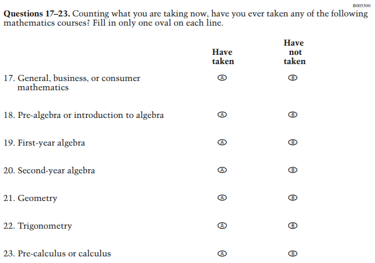 Counting what you are taking now, have you ever taken any of the following mathematics courses? Fill in only one oval on each line.