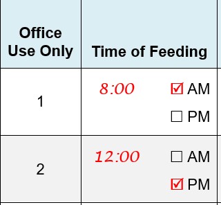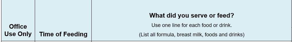Use a separate row for each item served or fed to the infant. The form continues onto the second page if you need additional space.