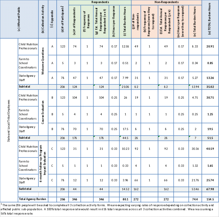 1 Calculated as 2.4 participants per each of the 50 States plus 3 participants from the U.S. territories. Note that some States will choose to send 3 Child Nutrition Professionals, and others 2 or less, so to account for the differeneces among States we are estimating 2.4 participants/State. 2 Calculated as 0.10 participants per each of the 50 States. Note that some States will choose to send a Farm to School Coordinator and some will not. Historically we have had less than 5 per year. 3 Calculated as 1.5 participants per each of the 50 States plus 3 participants from the U.S. territories. Note that some States will choose to send 1 State Agency representative, some will send 0, and some will send 2. Therefore, we attempted to account for the differences between States by rounding to 1.5 participants/State. |