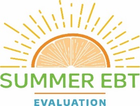 The Food and Nutrition Service (FNS) is conducting this study to obtain information about the experiences of the Summer Electronic Benefit Transfer (EBT) Project by grantees, retailers, school districts and participants. Participation in this study is voluntary and the information collected will be used to understand how Summer EBT projects are implemented in varying settings. This study does not collect personally identifiable information. Information collected in this study will be kept private to the full extent permitted by law. According to the Paperwork Reduction Act of 1995, an agency may not conduct or sponsor, and a person is not required to respond to, a collection of information unless it displays a valid OMB control number. The valid OMB control number for this information collection is 0584-0524. The time required to provide this information collection is estimated to average 1 minute per response, including the time to review instructions, search existing data resources, gather and maintain the data needed, and complete and review the collection of information. Send comments regarding this burden estimate or any other aspect of this collection of information, including suggestions for reducing this burden, to: USDA/Food and Nutrition Service, Office of Policy Support, 1320 Braddock Place, 5th Floor, Alexandria, VA 22314 ATTN: PRA (0584-0524)