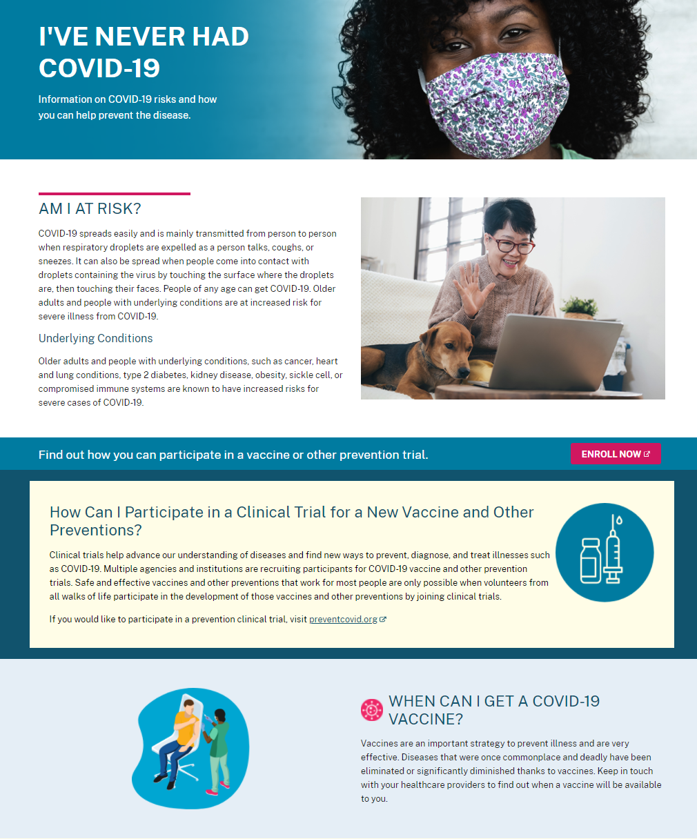 The purpose of this Bulletin Board Forum is to discuss your thoughts and feelings about some topics related to COVID-19 and clinical trials. We also want to hear your suggestions on how to best reach you with important information on what’s available for people who get exposed to or get sick with COVID-19. Your feedback will help us share this important information in the most effective way.]