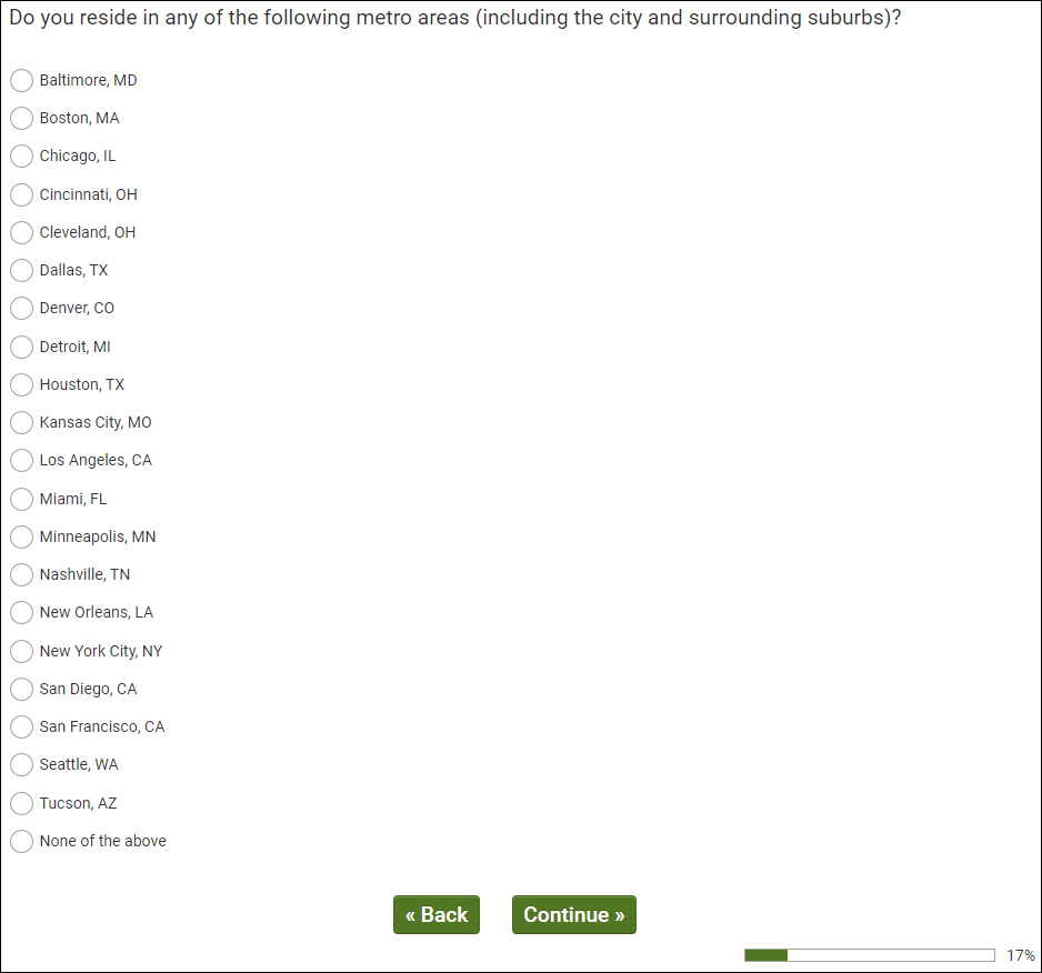 [MUST RESIDE IN TARGET DMA 1-20. TERMINATE IF Q5/96 – None of the above.]