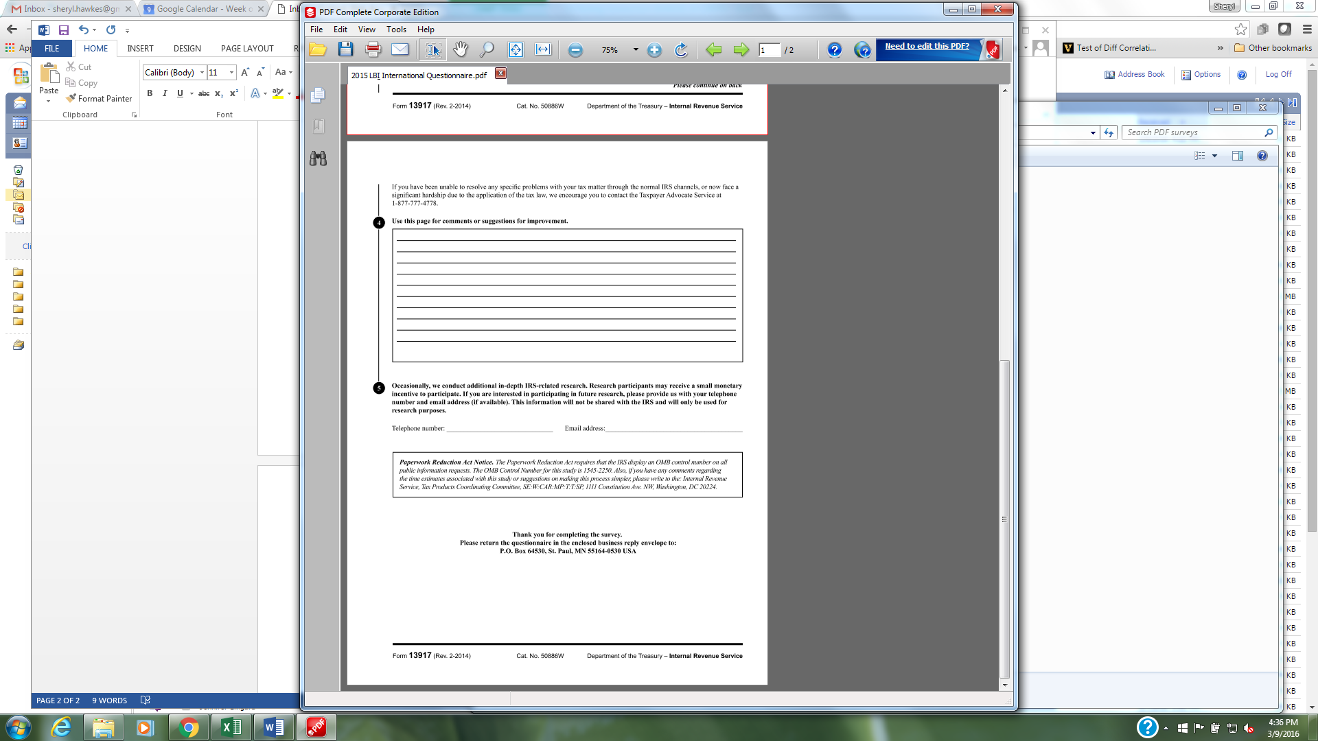 The Large Business and International Division (LB&I) of the IRS is polling taxpayers to obtain feedback on overall performance with recently closed examinations. This letter is to let you know that you have been randomly selected to participate in the survey. In about a week, you will be receiving a questionnaire in the mail. The questionnaire should take less than 10 minutes to complete.