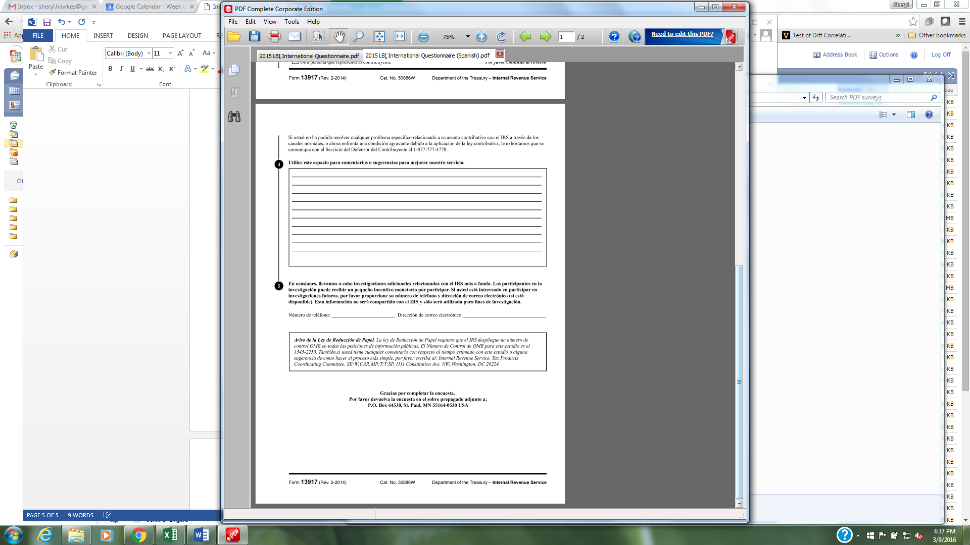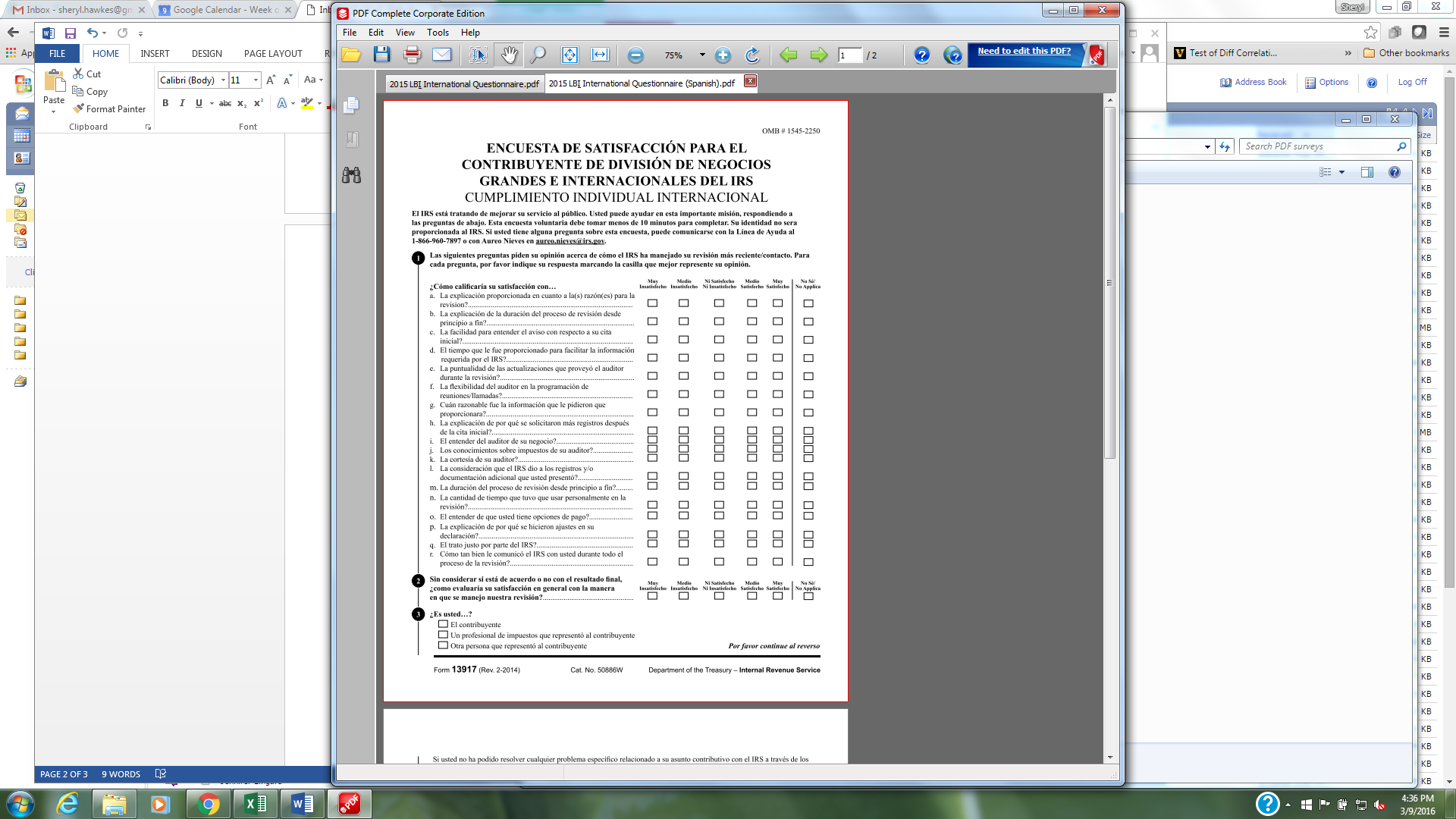 Si usted tiene alguna pregunta sobre esta encuesta, por favor llame a la Línea de Ayuda de la encuesta al 1-866-960-7897 o póngase en contacto con Aureo Nieves, Analista Principal de Normas de LB&I por correo electrónico a aureo.nieves@irs.gov. Gracias de antemano por su interés en mejorar nuestros servicios.