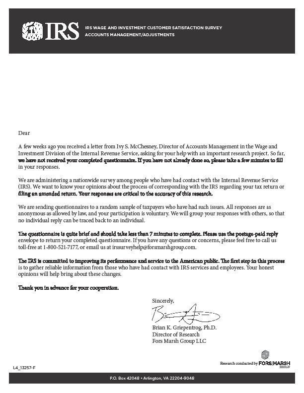 Recently, you received a questionnaire asking your opinions about the services you received from the IRS in a recent contact. If you have already completed and returned the questionnaire, please accept our sincere thanks. If not, please take a few minutes to complete it and return it today. We want to be sure we have your opinions and suggestions.