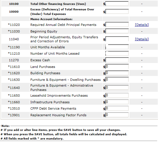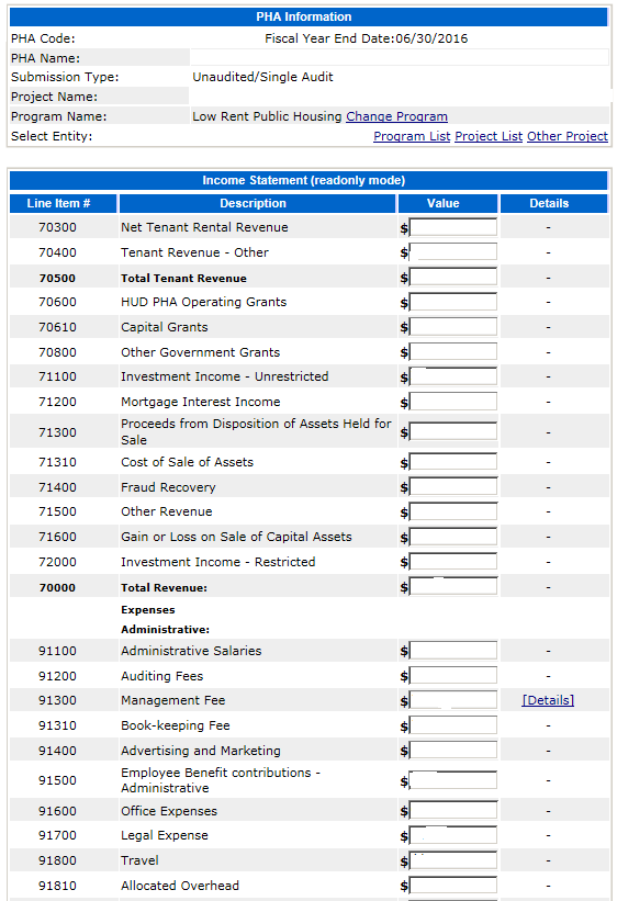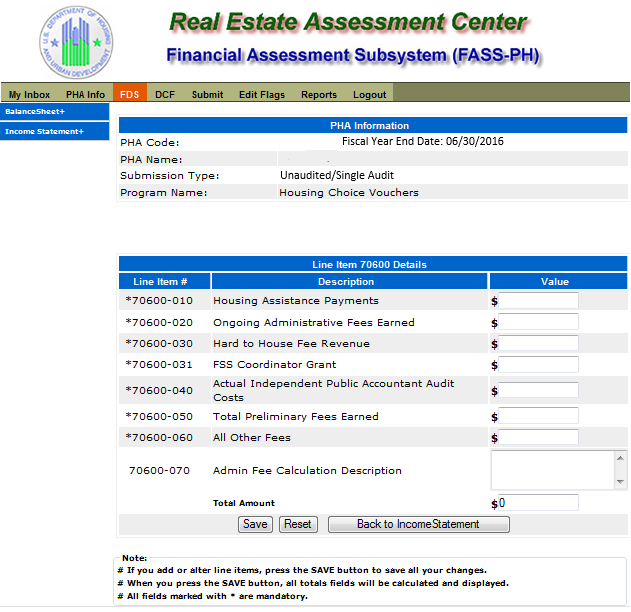 The following screen provides the detail link associated with the following FDS Line Item: 70600. This detail link is only applicable to the Housing Choice Voucher Program.