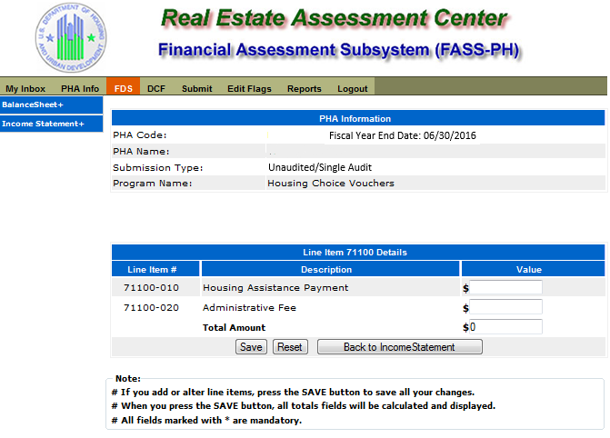 The following screen provides the detail link associated with the following FDS Line Item: 71100. This detail link is only applicable to the Housing Choice Voucher Program.