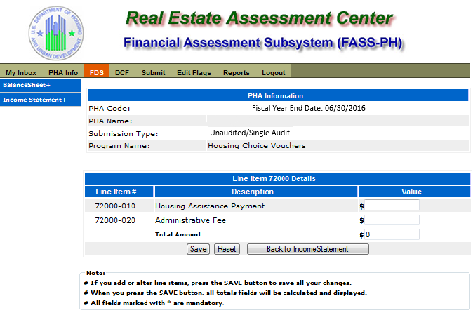 The following screen provides the detail link associated with the following FDS Line Item: 72000. This detail link is only applicable to the Housing Choice Voucher Program.