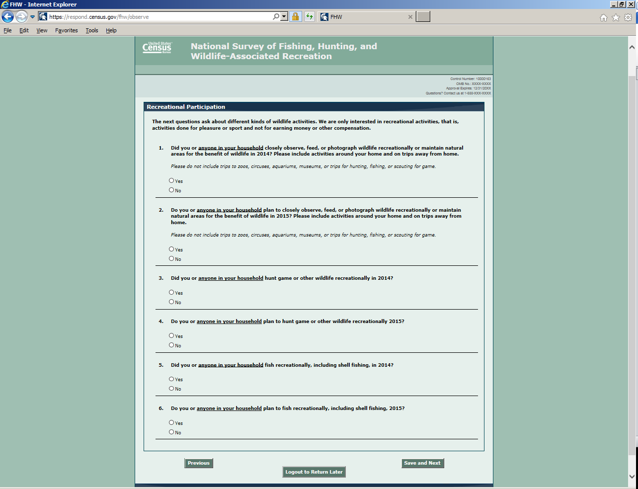 1. Did you or anyone in your household closely observe, feed, or photograph wildlife recreationally or maintain natural areas for the benefit of wildlife in 2015 or so far in 2016? Please include activities around your home and on trips away from home.