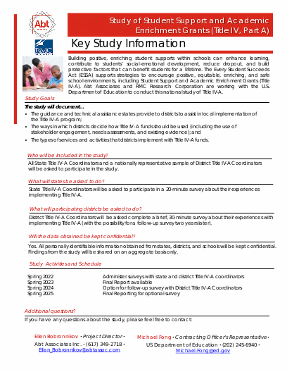 Our contractor, Abt Associates (Abt) will contact your state Title IV, Part A coordinator shortly to provide additional information about the study and request contact information for district Title IV, Part A coordinators. If you have any questions, you may contact the Study Director, Ellen Bobronnikov, at ellen_bobronnikov@abtassoc.com or 617-349-2718 or Michael Fong at the U.S. Department of Education at michael.fong@ed.gov or (202) 245-8407.