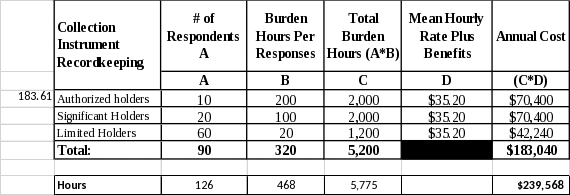 Section 183.61: Records. Each authorization holder shall maintain at its facility current records that document the approvals they perform for the FAA. Each authorization holder must submit reports as required by the FAA. The recordkeeping requirements are dependent on the type of authorization holder. The following estimates are based on the assumption that there will be nine organizations with large ODA systems covering multiple ODA types, 20 organizations with significant ODA systems covering multiple approvals, and 55 organizations with very limited authority.