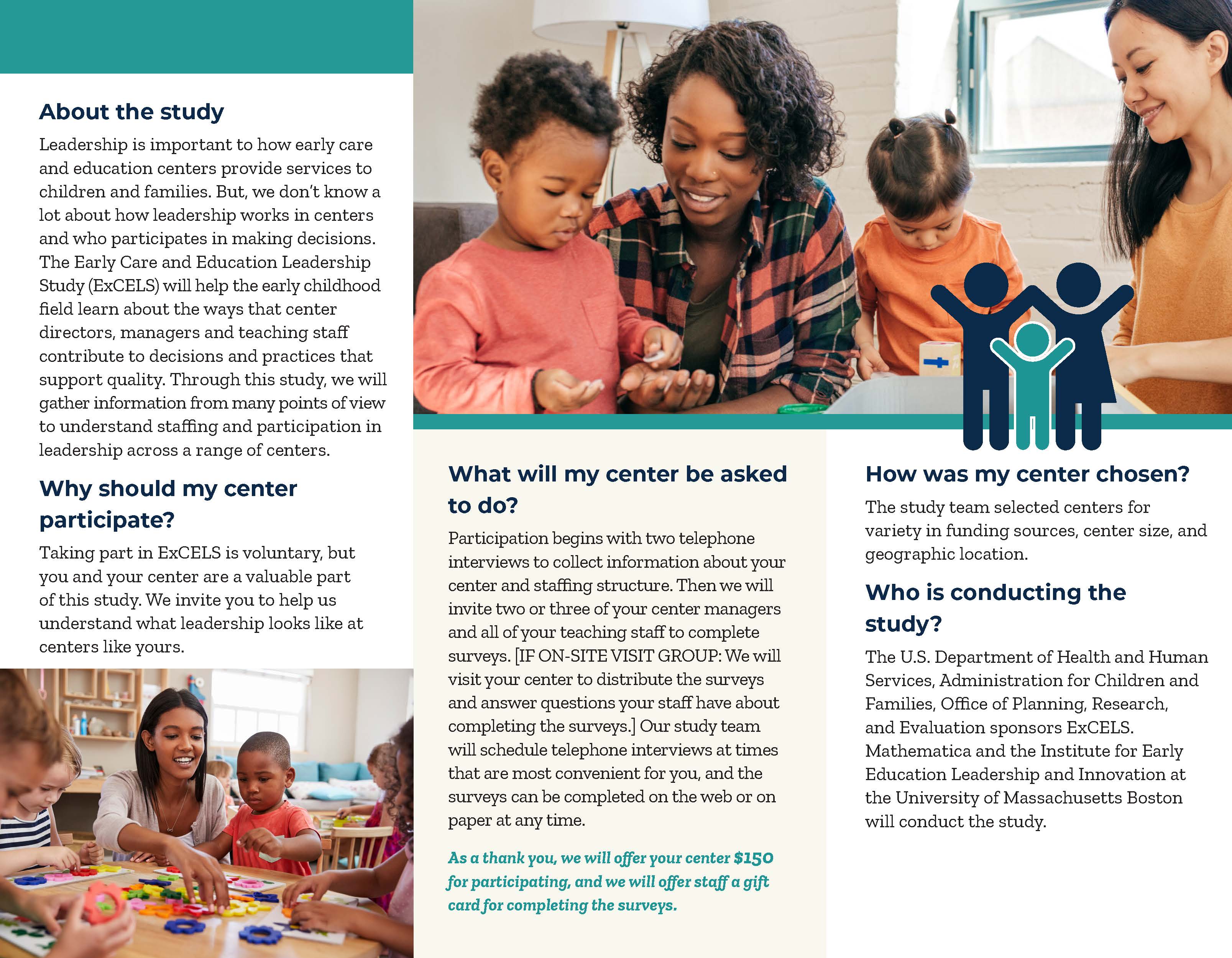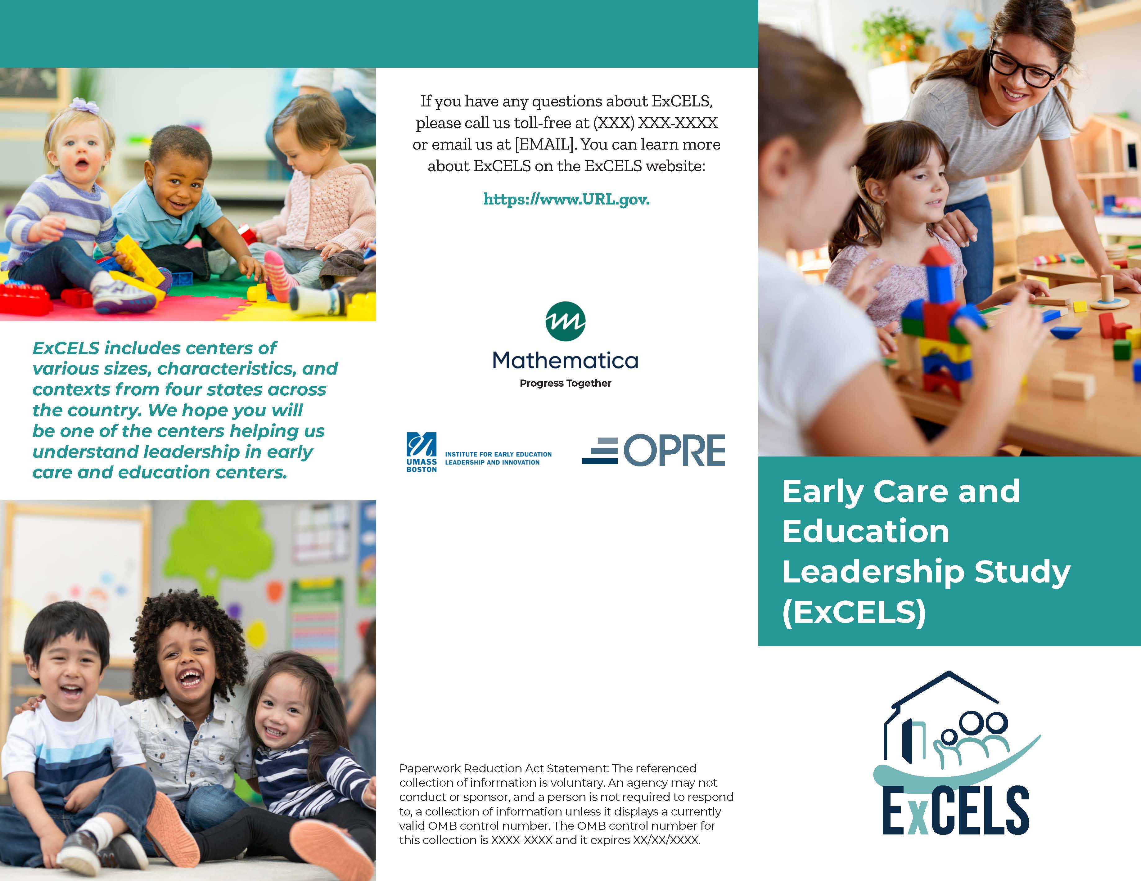 We are reaching out to ask your center to be part of an important study, the Early Care and Education Leadership Study, or ExCELS. As you know, leadership is widely recognized as an essential driver of performance and improvement in an organization. Little is known about who participates in leadership in early care and education centers, and what role leadership plays in improving the quality of care and education a center provides and outcomes for staff, children, and families. The U.S. Department of Health and Human Services, Administration for Children and Families, Office of Planning, Research, and Evaluation has partnered with Mathematica, an independent research firm, and the Institute for Early Education Leadership and Innovation at the University of Massachusetts Boston to conduct ExCELS. ExCELS will help us learn how effective leadership can improve the quality and outcomes for staff, children, and families in early care and education centers!