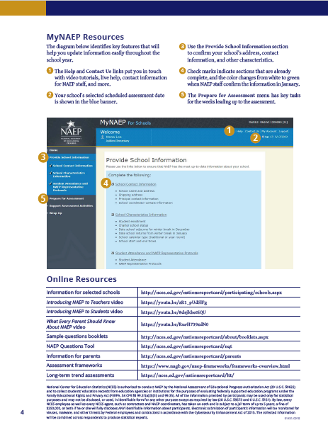 More information about your responsibilities is provided in the enclosed School Coordinator Responsibilities: A Guide to MyNAEP. Additional information about NAEP can be found at http://nces.ed.gov/nationsreportcard.