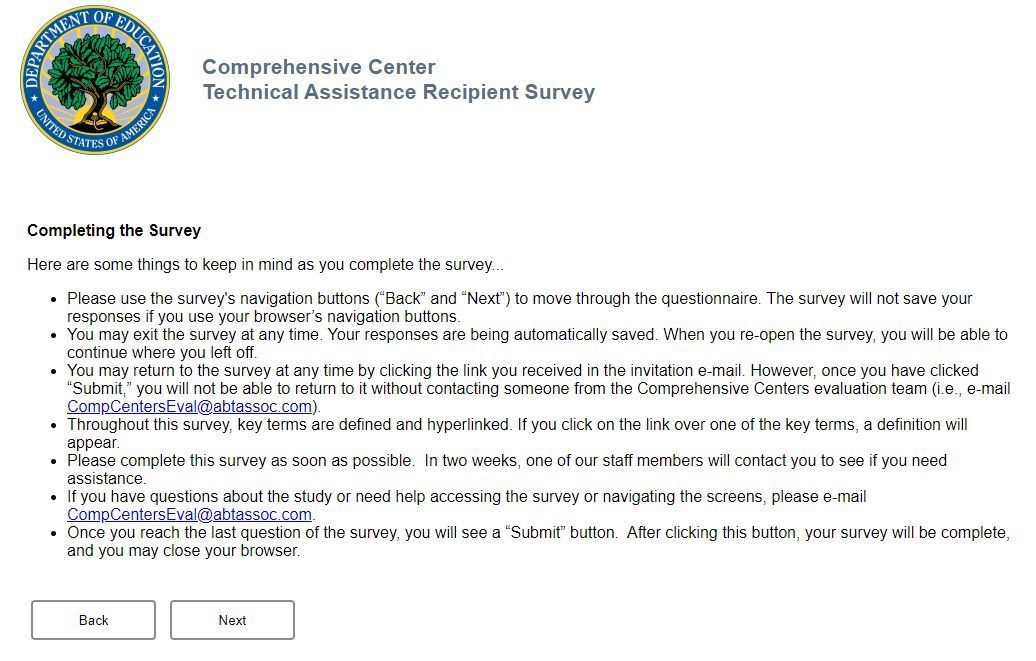 The U.S. Department of Education’s Comprehensive Center Network (CC Network) is intended to help State Education Agencies (SEAs) and Local Education Agencies (LEAs) improve educational outcomes for all students, close achievement gaps, and improve the quality of instruction. The U.S. Department of Education is sponsoring a study to examine whether the Comprehensive Centers helped to meet these goals and what challenges remain to capacity building. Abt Associates is carrying out the study on behalf of the Department. You can help the U.S. Department of Education improve supports and services offered by the Comprehensive Centers by participating in this survey. We are asking you to complete a short survey about your overall experience working with the Comprehensive Centers. The survey should take about 20 minutes to complete for each Comprehensive Center project you lead within your agency.