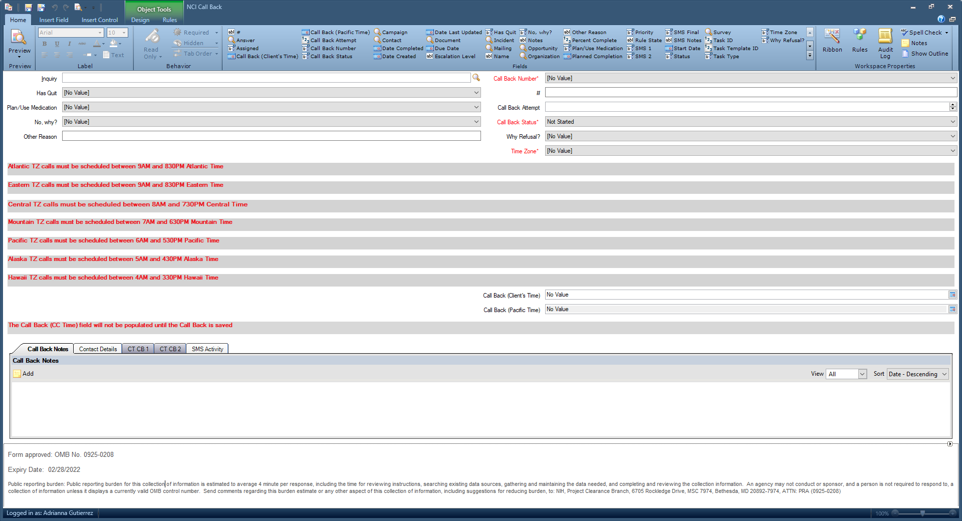 NCI Call Back Workspace: OMB # 0925-0208