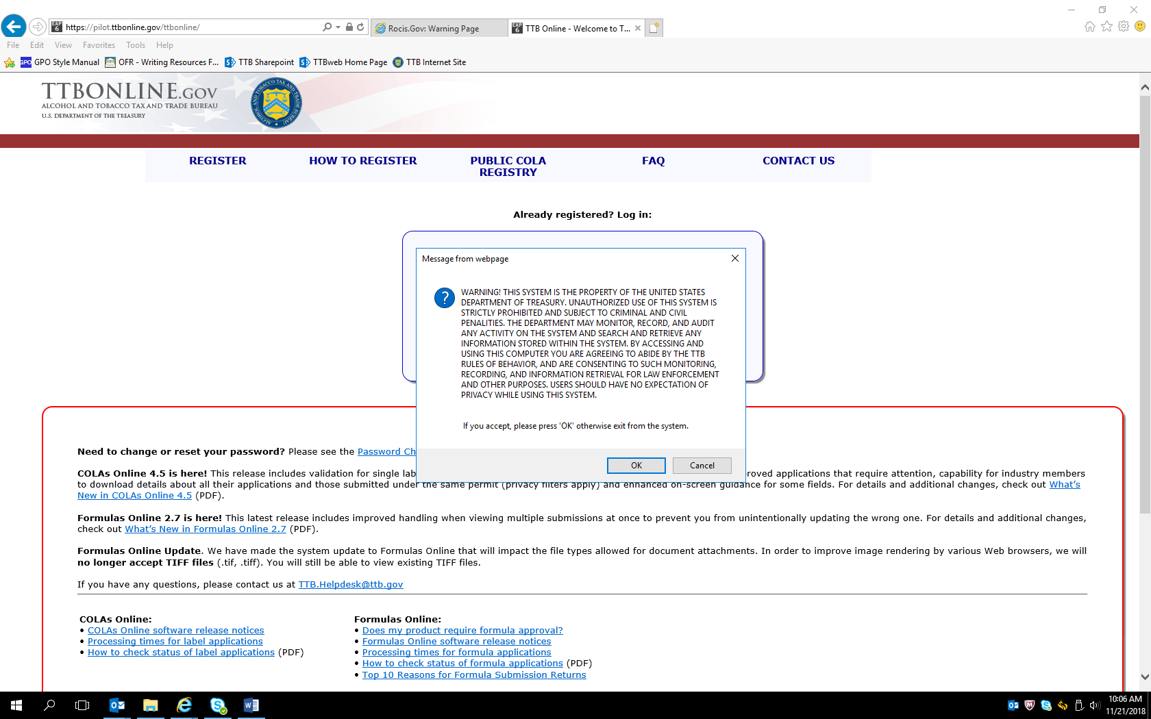 User clicks “OK” to acknowledge the Government System Warning.