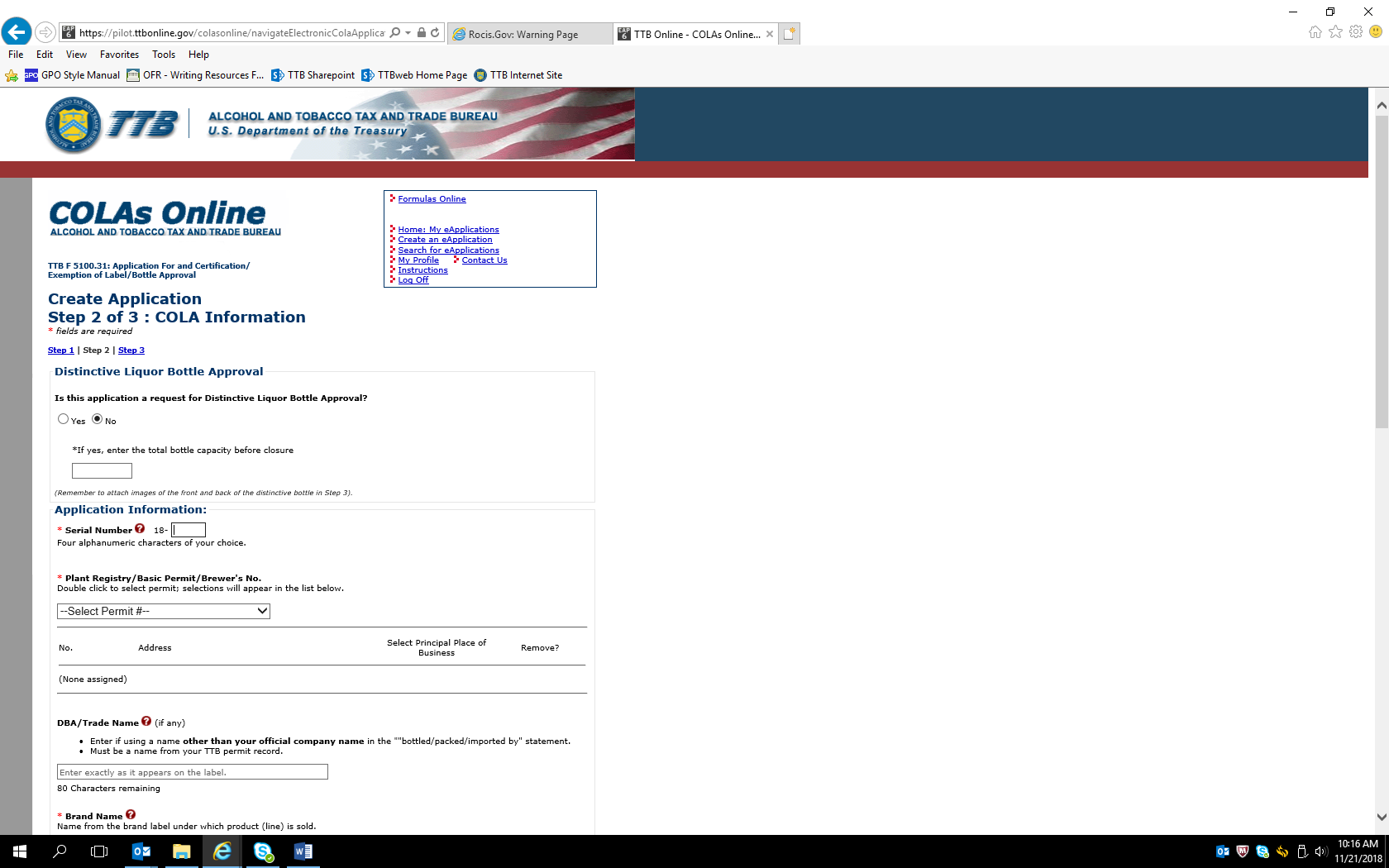 Create Application — Step 2 of 3: COLA Information