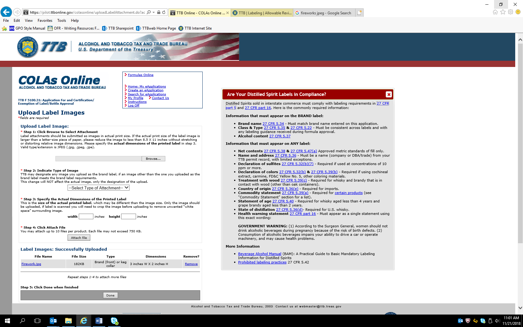 User uploads image of the proposed label and adds other required information, then clicks “Done” when finished. Example given here shows an image file named “Fireworks” has been uploaded as the label image.