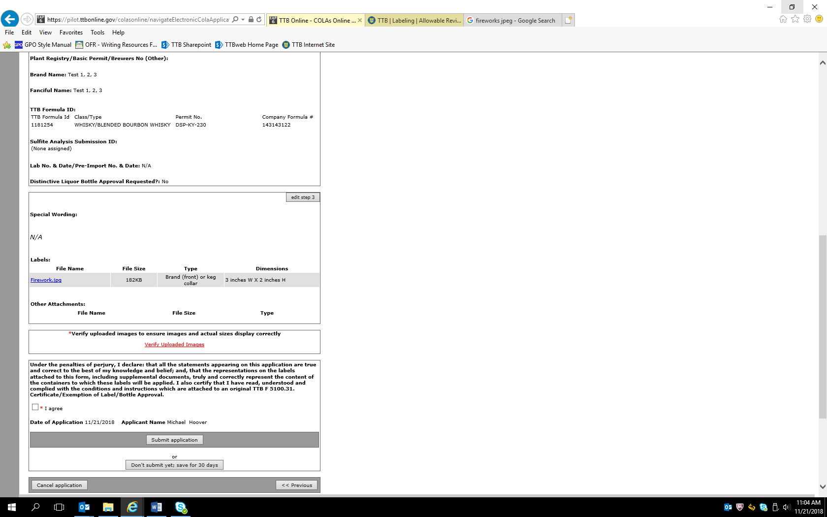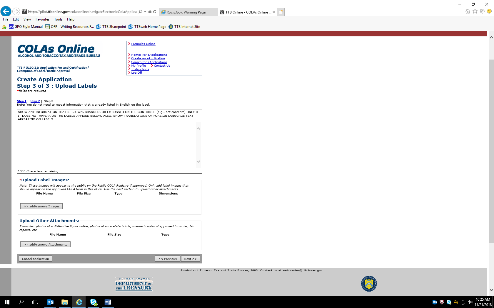 Screen Shots of COLAS Online, the electronic equivalent of TTB F 5100.31, Application for and Certification/Exemption of Label/Bottle Approval.
