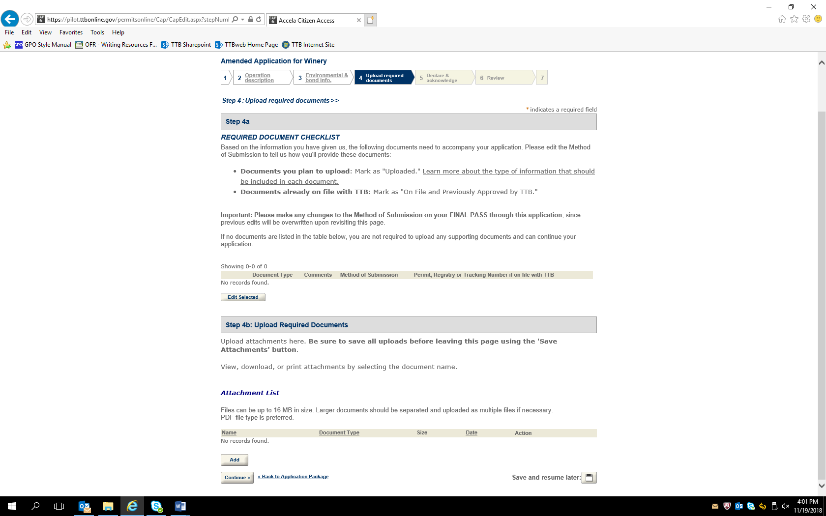 The user submits the application with the attached TTB F 5000.18 to TTB by clicking “continue,” reviewing the submitted information on a subsequent review screen, and then clicking “Submit” on the final screen (Review and Submit screens not shown.)