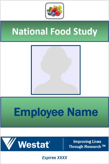 Westat, a research firm located in Rockville, Maryland, is conducting this important study for the USDA. A Westat interviewer, wearing an ID badge similar to the one displayed here, will come to your home to tell you more about the study and explain how to keep track of and record all of the food your household gets. Westat requires that all interviewers be fully vaccinated against COVID-19 and that they wear a mask for the duration of the visit to your home.