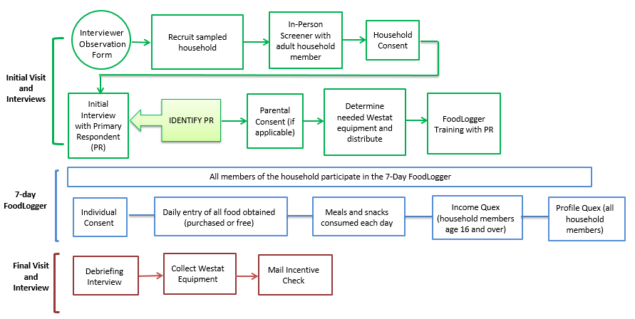 Figure 1-1 above is a flowchart, which explains the order of data collection activities. The activities in green denote the initial visit events and interviews. The boxes in blue represent the activities during the 7-day study week and the red at the bottom show the final visit interviews.