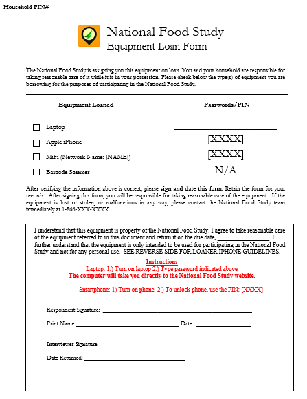 To ensure every eligible household will be able to participate in the NFS Field Test, Westat will provide a laptop, MiFi device, barcode scanner, and/or smartphone to households that do not already own the technology. You will be responsible for determining the specific devices each household will need to participate in the study, distributing and tracking the equipment in CAPI, and collecting the equipment at the end of the study week. The devices used for this study are expensive and the property of Westat. Maintaining the equipment and ensuring it is returned are important aspects of your job as a Westat field interviewer.